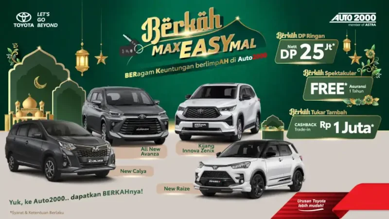Bulan penuh berkah telah tiba, saatnya Anda mewujudkan impian memiliki mobil Toyota baru dengan penawaran yang benar-benar maksimal! Hanya di Auto2000, Anda bisa membawa pulang unit andalan seperti All New Avanza, Kijang Innova Zenix, New Calya, hingga New Raize dengan skema DP Ringan mulai dari Rp 25 Juta saja.